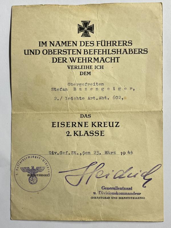 4) EK II citation which has been issued at the divisional command post of the 1.Fschj.Div. and which bears the stamped signature of "Generalleutnant" and divisional commander Richard Heidrich