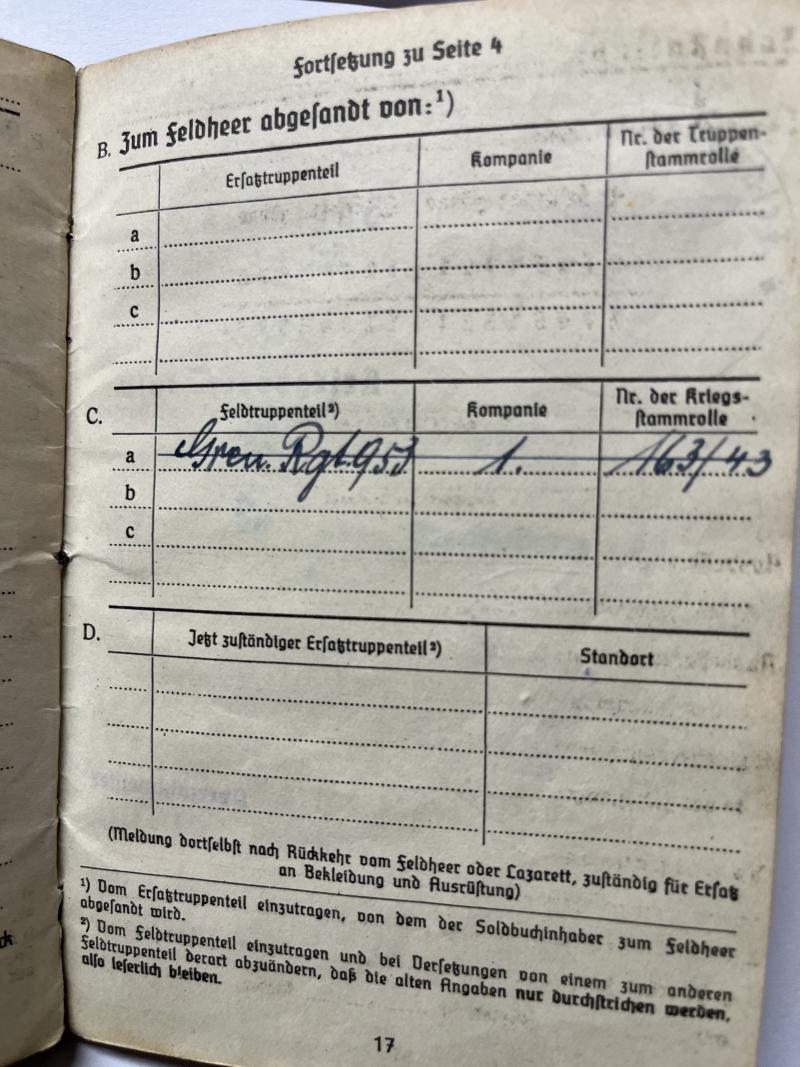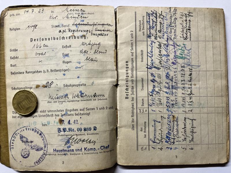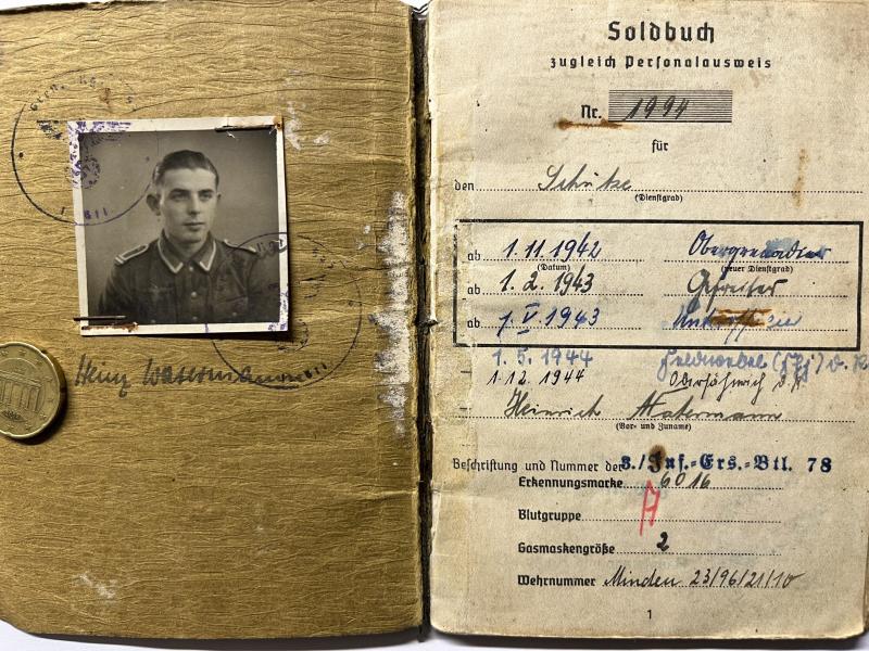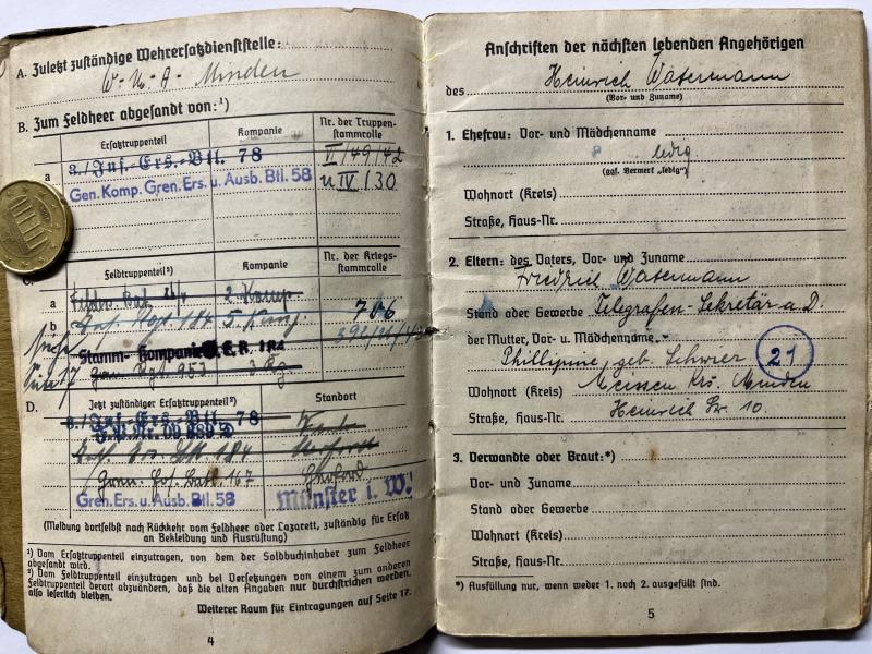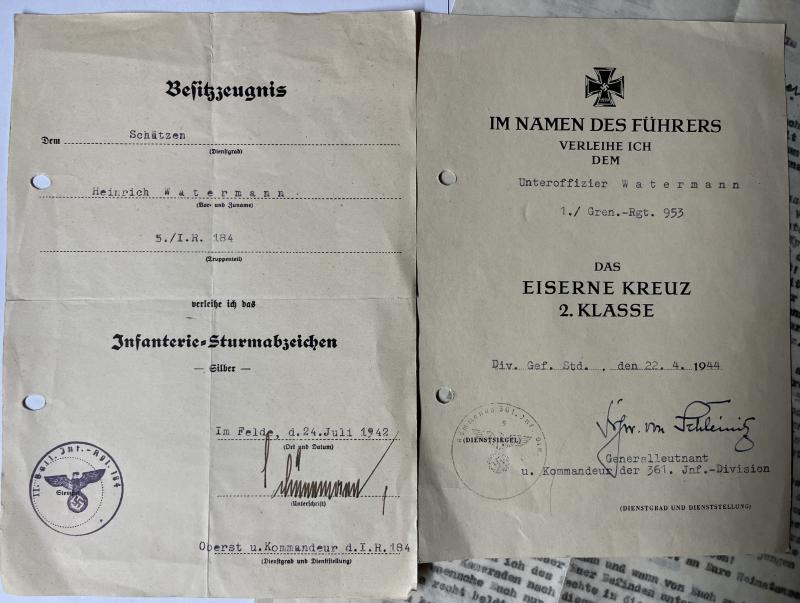 Soldbuch and citations of "Oberfähnrich der Reserve" Heinrich Watermann who served finally within Gren.Rgt.953 of the 361.VGD.