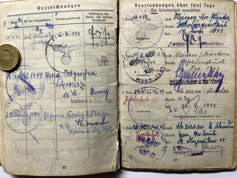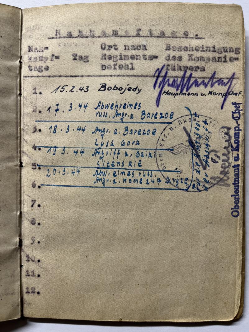 The Soldbuch shows a 5 day "Nahkampftage" list of fightings in Russia.