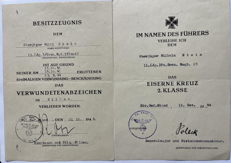 Citation set of "Oberjäger" Wilhelm Stein who served within Pz.Gren.Rgt.15 of the 29.Pz.Gren.Div.