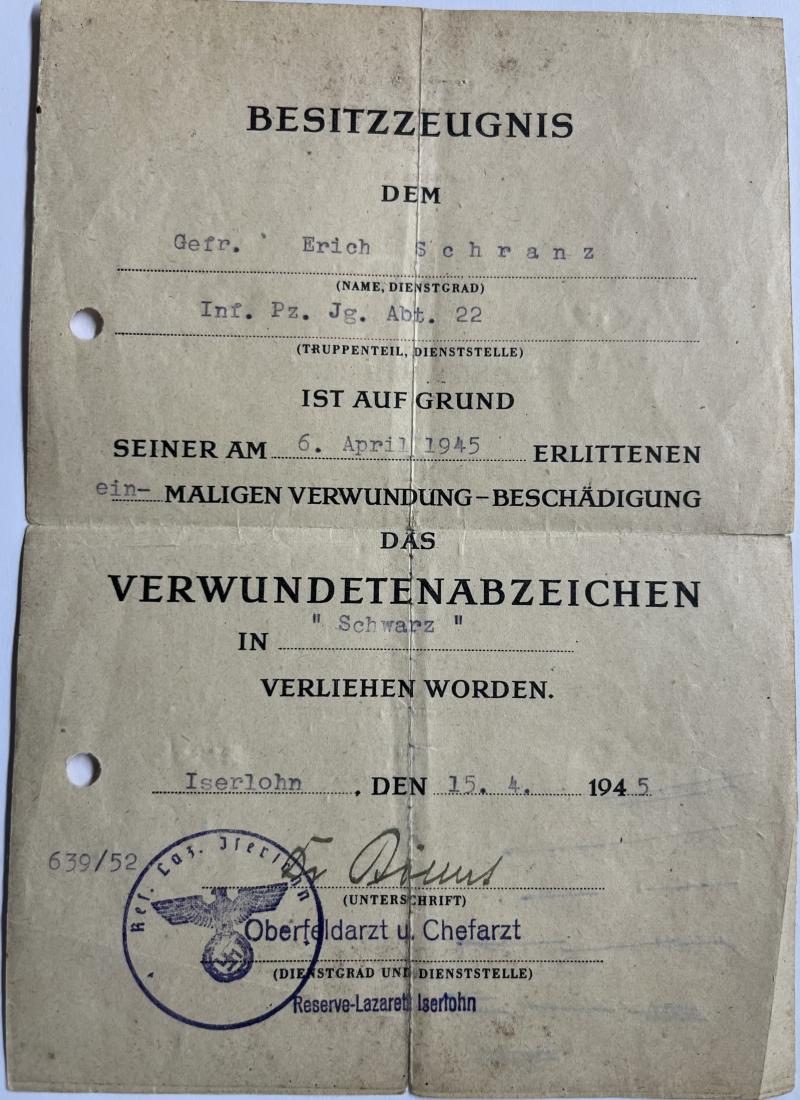 Not entered in the Soldbuch is that Schranz seems to have ended his service within Inf.Pz.Jg.Abt.22 of the 22.(L.L.) Div.