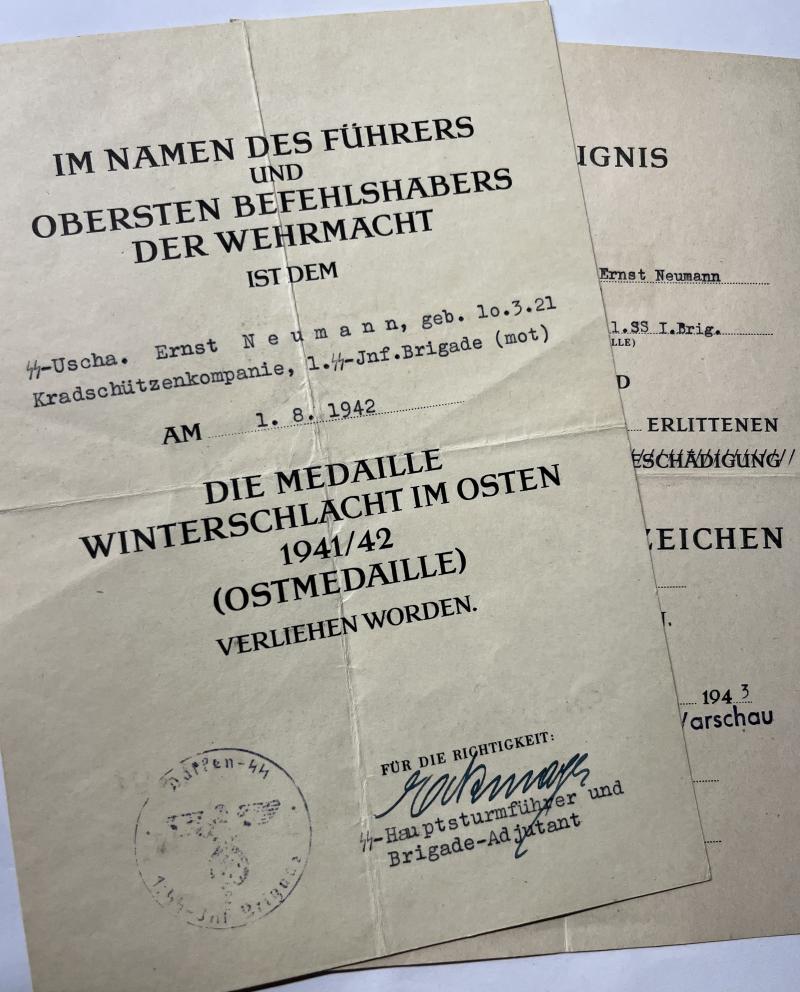 Citation set of "SS-Unterscharführer" Erns Neumann who served within Kradschützenkompanie of the 1.SS-Inf.Brigade (mot).