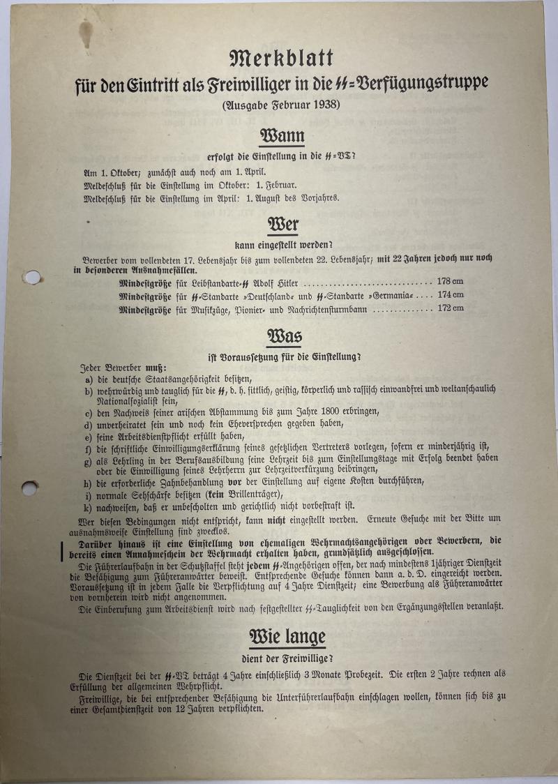 Rarely seen "Merkblatt" (information sheet) for "SS-Verfügungstruppe" from 1938 in A4 size read more