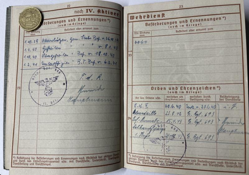 Wehrpass and citations of "Unteroffizier" Karl Einhäuser who served within Stab Gren.Rgt.Gruppe 691