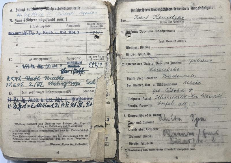 1) "Zweitschrift" Soldbuch of Pz.Jäg.Abt.2 Konietzke (photo missing,few pages loose but complete)