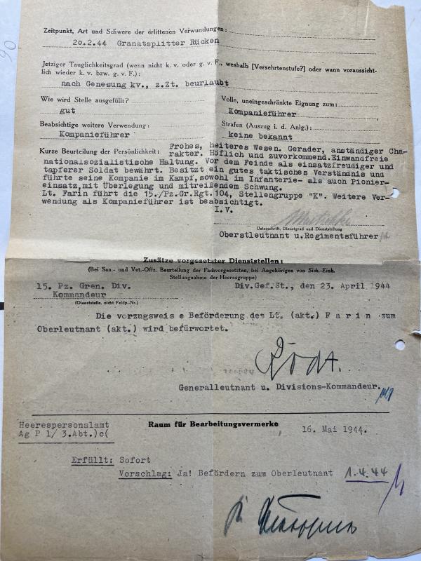 2) "Vorschlag" (proposal) to be promoted to "Oberleutnant" as Farin served as "Kompanieführer" within Pz.Gren.Rgt.104 of the 15.Pz.Gren.Div.