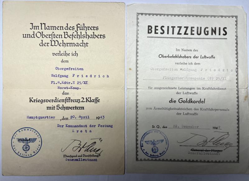 1) "Goldkordel zum Ärmelabzeichen des Kraftfahrpersonals der Luftwaffe" citation which has been signed by "Der Befehlshaber und Kommandeur der Festung Kreta" Bruno Bräuer (RK 24-5-1940,DKiG 13-4-1942) in the rank of "Generalleutnant".