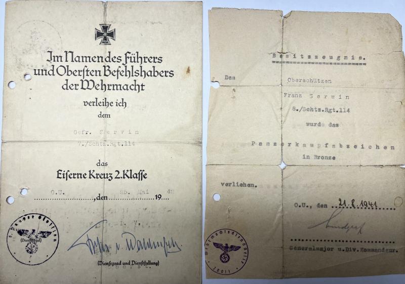 1) "Panzerkampfabzeichen in Bronze" citation which has been signed by "Generalmajor" and divisional commander Franz Landgraf (RK 16-6-1940).
