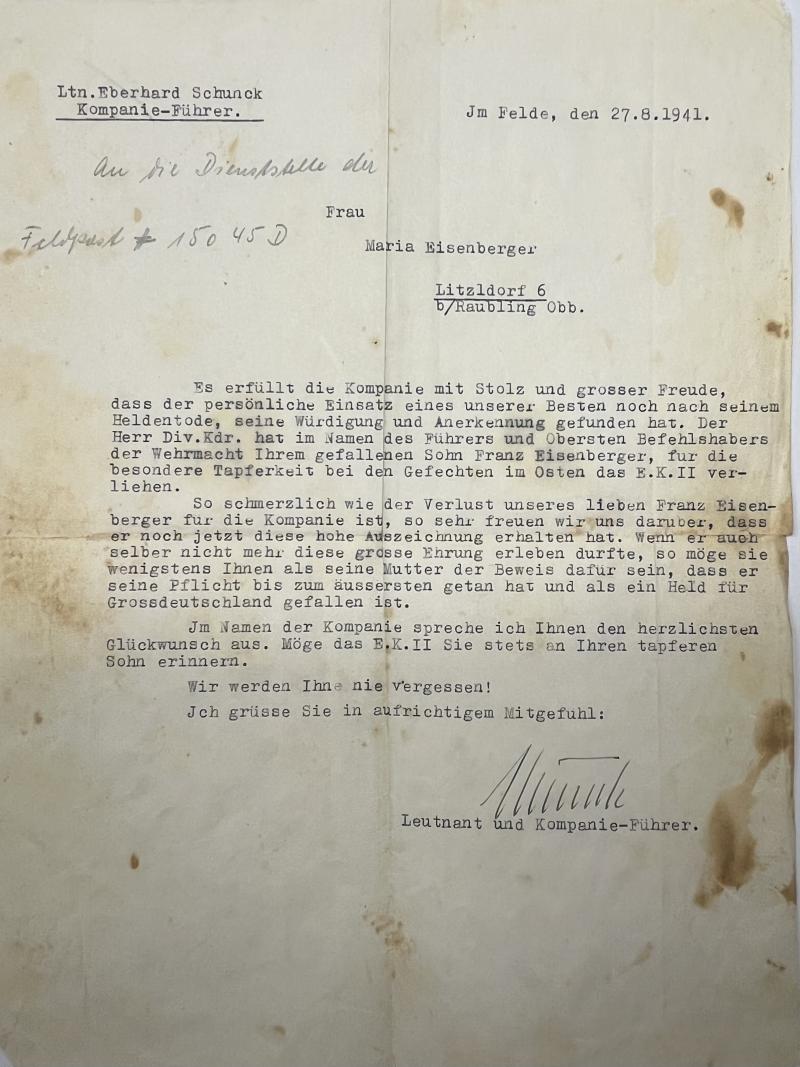 Comes with a letter from the unit commander which emphasizes ,"mit Stolz und grosser Freude" (proud and great joy) the fact that Franz Eisenberger has been awarded the EK II according to his heroic status.