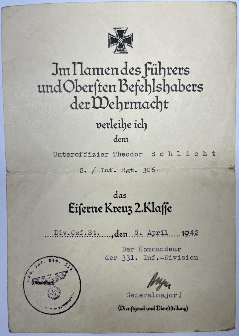 EK II citation of "Unteroffizier" Theodor Schlicht who served wiithin Inf.Rgt.306 of the 331.Inf.Div.