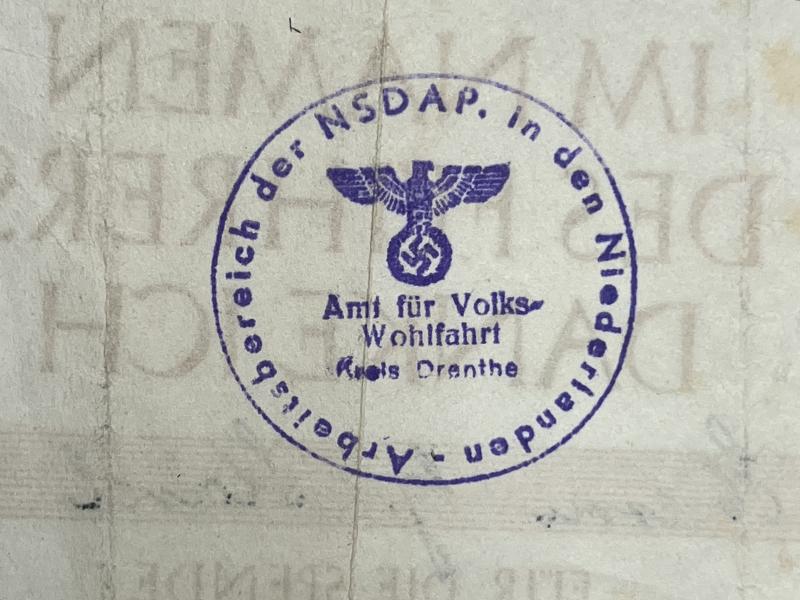 "Sammlung von Woll,Pelz und Wintersachen für die Front" citation of Mr.J.Karel who must have been a Dutchmen as this citation has been printed in the Netherlands (K 1030) and was handed out on behalf of "Arbeitsbereich der NSDAP in der Niederlanden-Kreis Drenthe"!