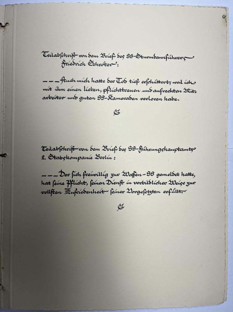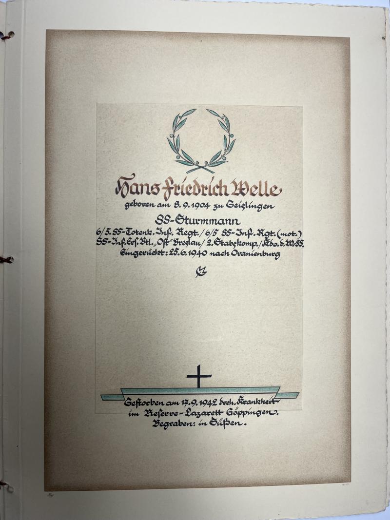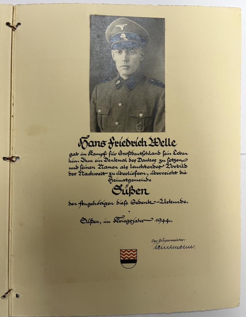 "Gedenk Urkunde" (remembrance certificate) grouping of "SS-Mann" and "Ortsgruppenleiter der NSDAP Ortsgruppe Süssen" Hans-Friedrich Welle.