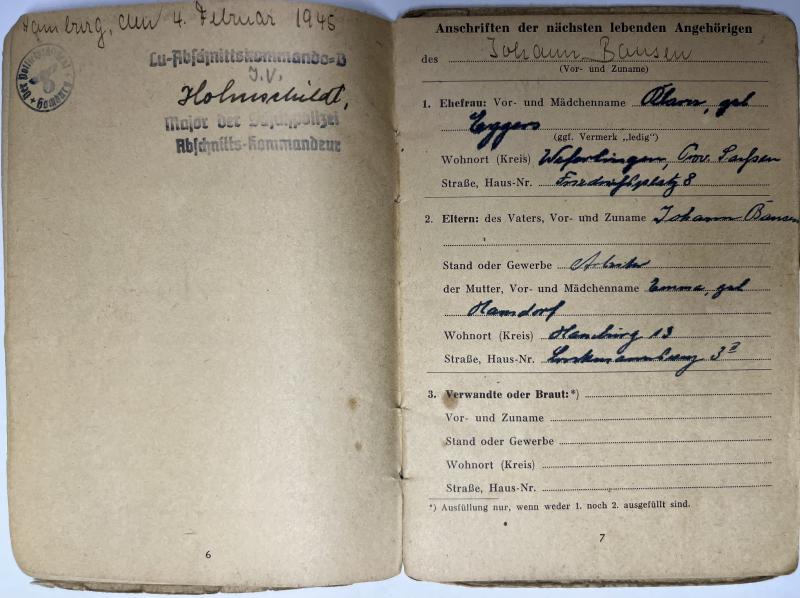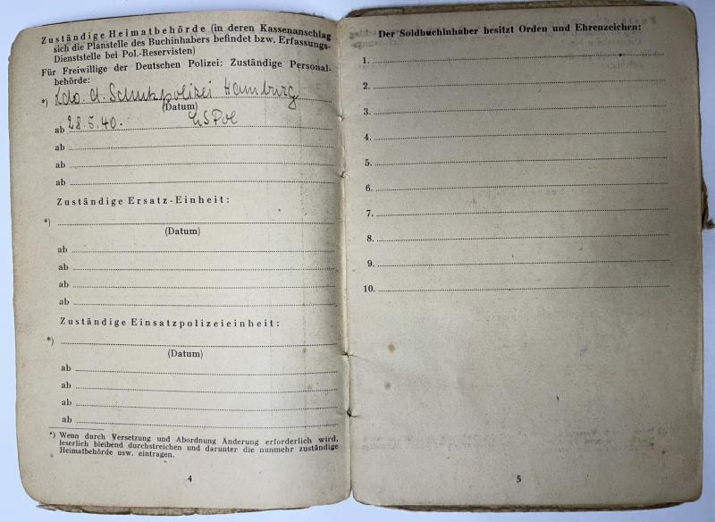 "Polizei" Solbuch and Wehrpass of "Wachtmeister der Schutzpolizei" Johann Bansen who served within the "Luftschutzpolizei" under command of "Kommando der Schutzpolizei Hanburg".