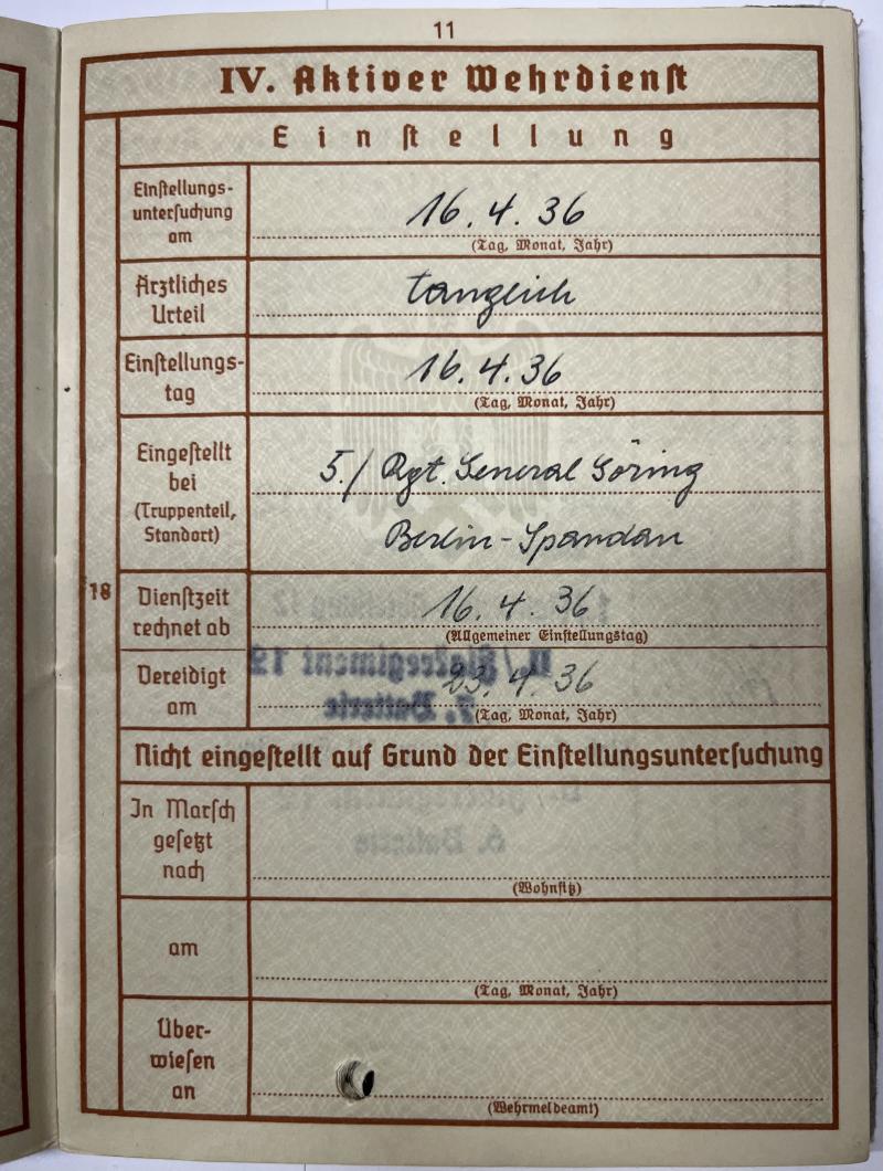 Wehrpass of "Unteroffizier" Kürt Gottschlag who started within Rgt.General Göring in 1936.