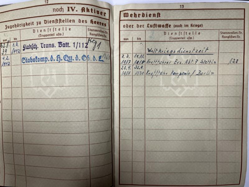 Wehrpass of "Planmäsige Oberfeldwebel" Franz Weinschenker who had served during WW I and served within Stabskp.Hauptquartier des Oberbefehlshaber der Luftwaffe finally.