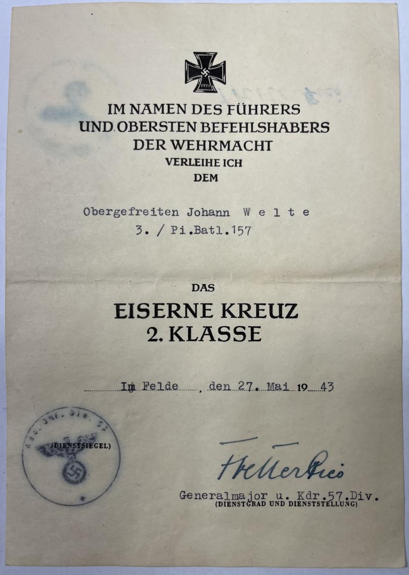 EK II citation of "Obergefreiten" Johann Welte who served within Pi.Batl.157 of the 57.Inf.Div.