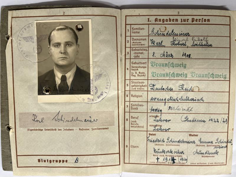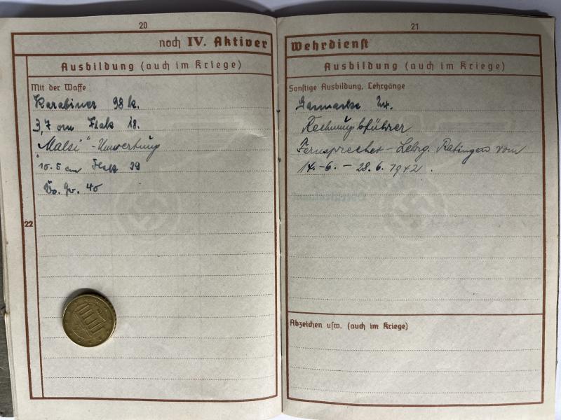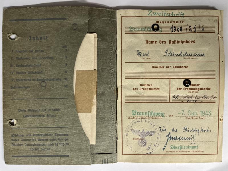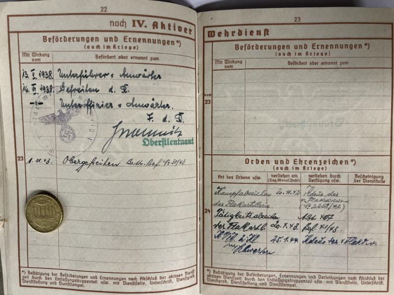 Wehrpass of "Obergefreiten" Karl Schindelmeiser who served within Schw.Flak Abt.407 of the 4.Flak Div.