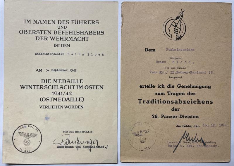 Citation set of "Stabsintendant" Heinz Bloch who served within Versorgungs Komp./II.Panzer-Rgt.26 of the 26.Pz.Div.