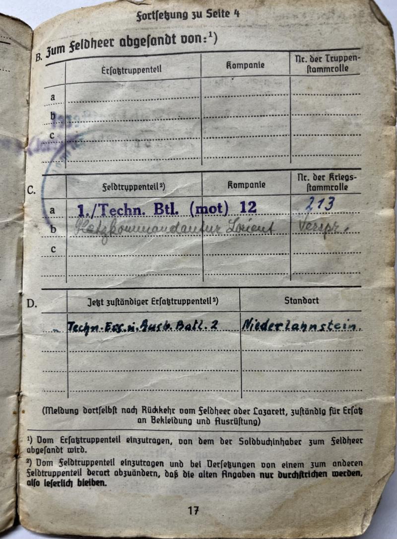 Behind the "Platzkommandantur Lorient" entry ,the Soldbuch shows "Verspr." which most probably means "Versprengter" (scattered) because of the fact that a great part of the Lorient garrison consisted of bits and pieces of battered units.