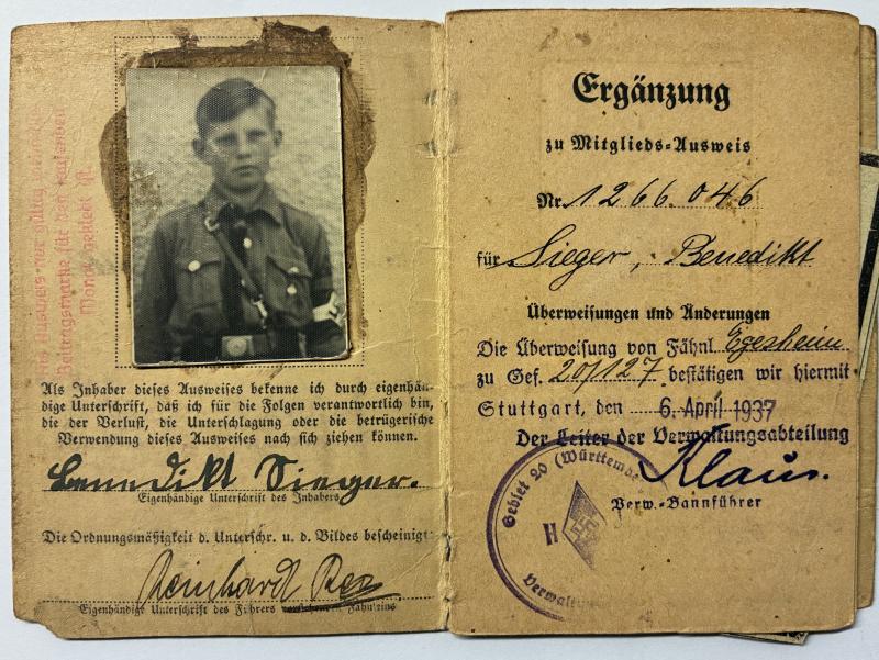 1) "Deutsche Jungvolk" I.D.card with "Ergänzung" (addition)
