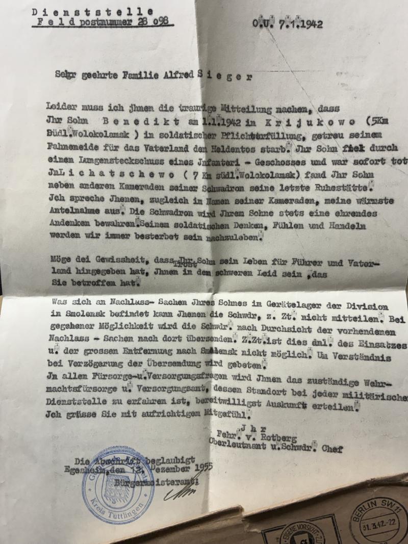 2) Wehrpass of Sieger was awarded the "Sturmabzeichen" and wasKIA on 31-12-1941 at Krijukowo (Russia)