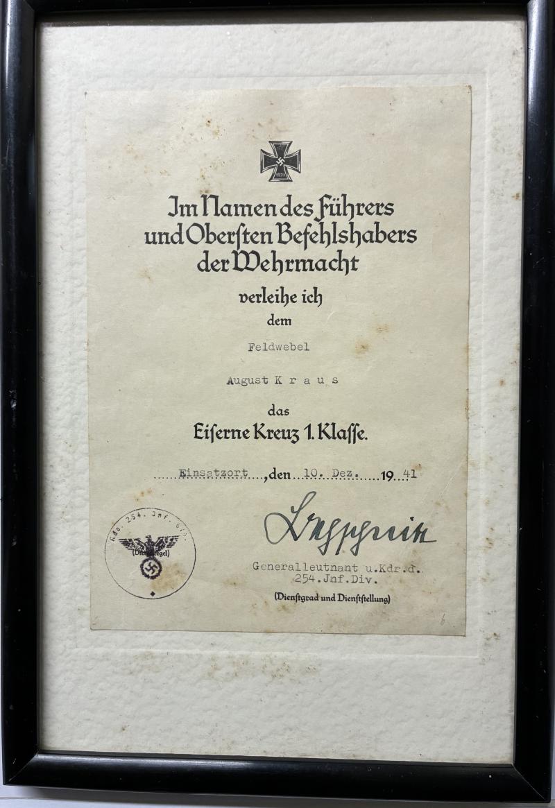 EK I citation which has been signed by "Generalleutnant" and divisional commander Walter Behschnitt (DKiG) Nice original framed EK I citation!