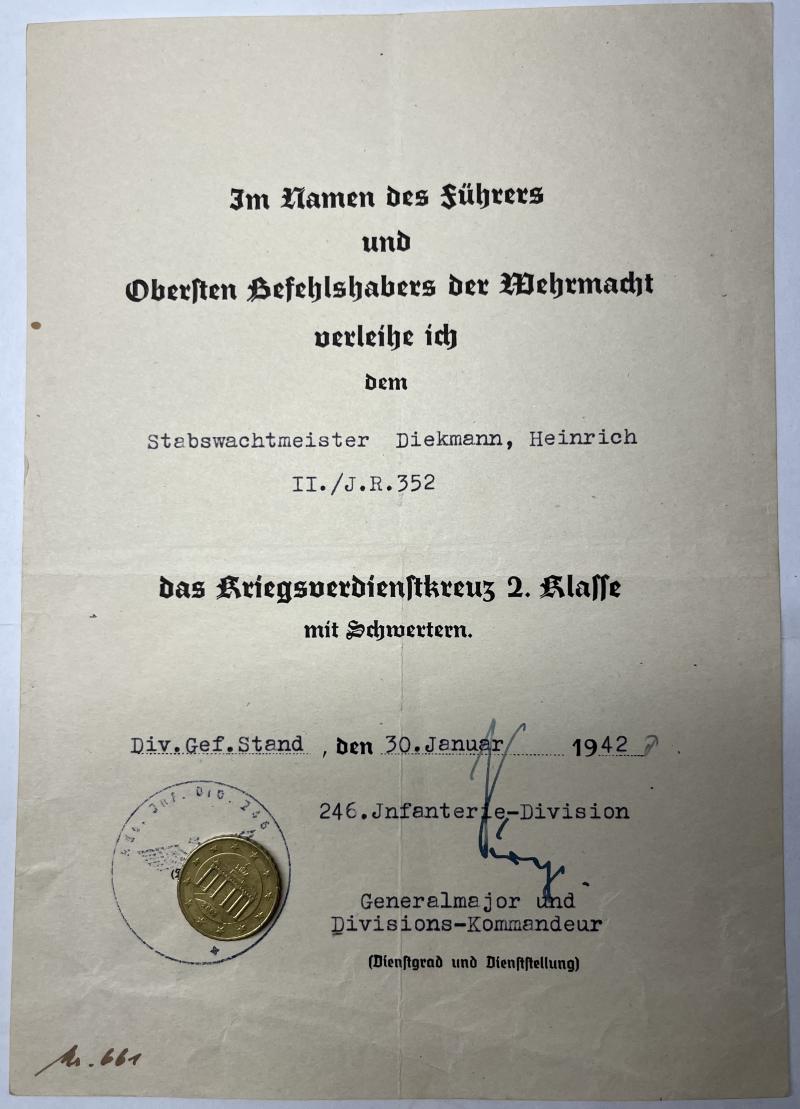 2) "Infanterie-Sturmabzeichen in Bronze" citation (handed out the same day as BWB) which has been signed by "Oberstleutnant" and regimental commander Claus Mueller-Bulöw