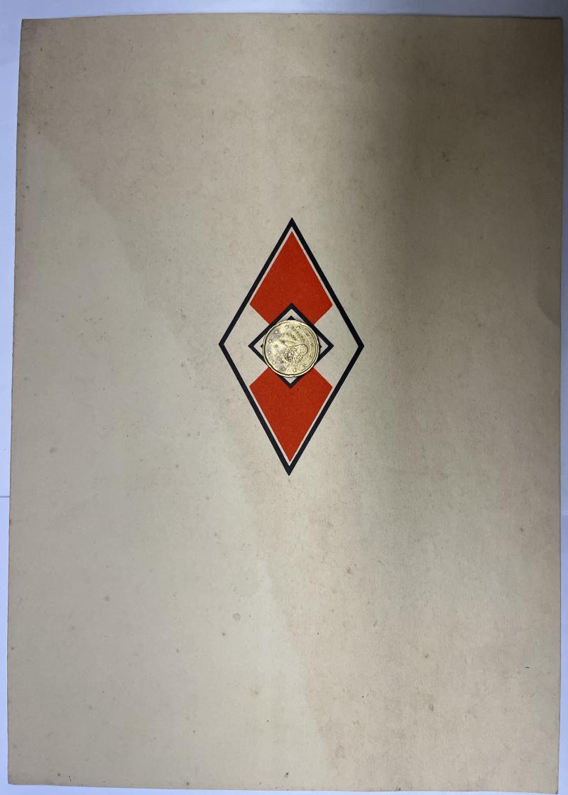 Very attractive A4 size confirmation form/citation which has not been handed-out (though filled in) to ? who entered the "Hitler-Jugend" on the birthday of Adolf Hitler (20-4-1939).