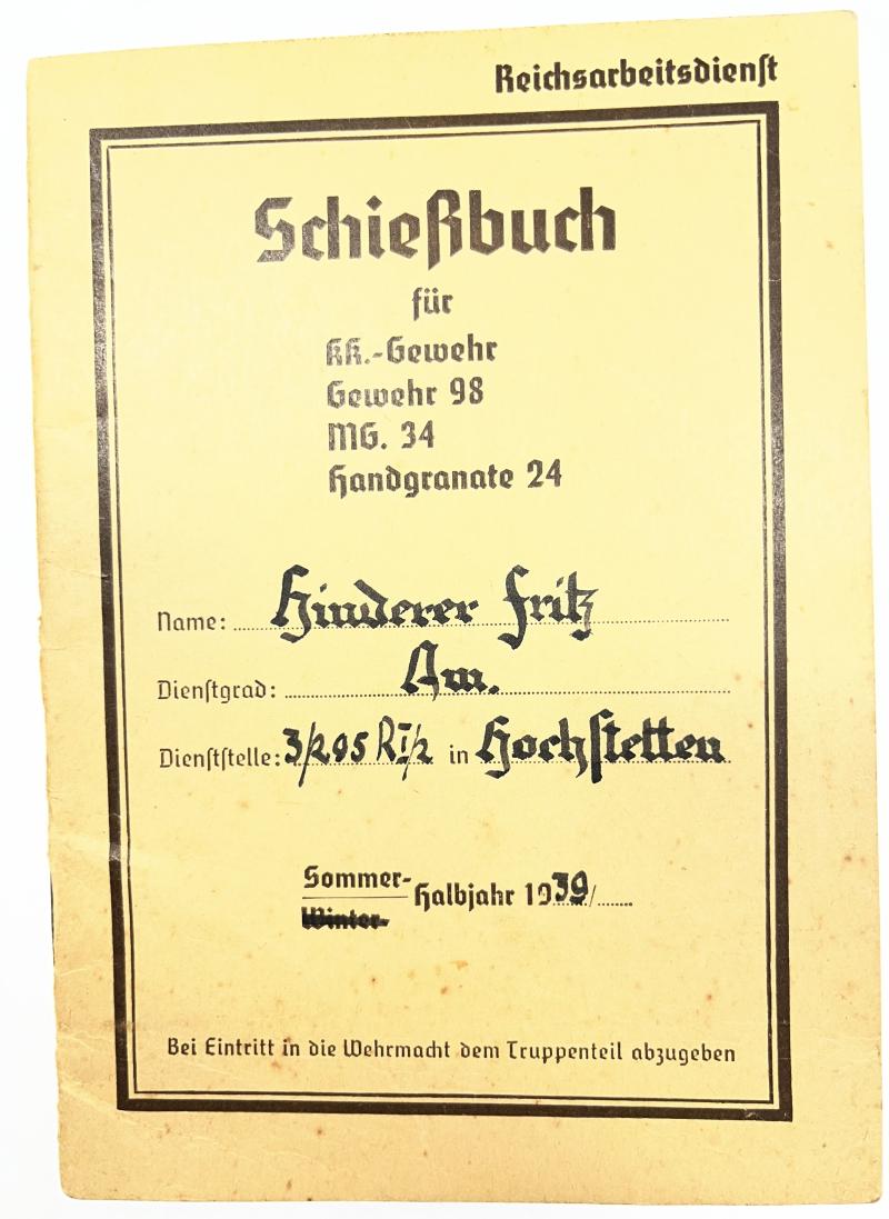 Schiessbuch of Fritz Hinderer who served within the RAD