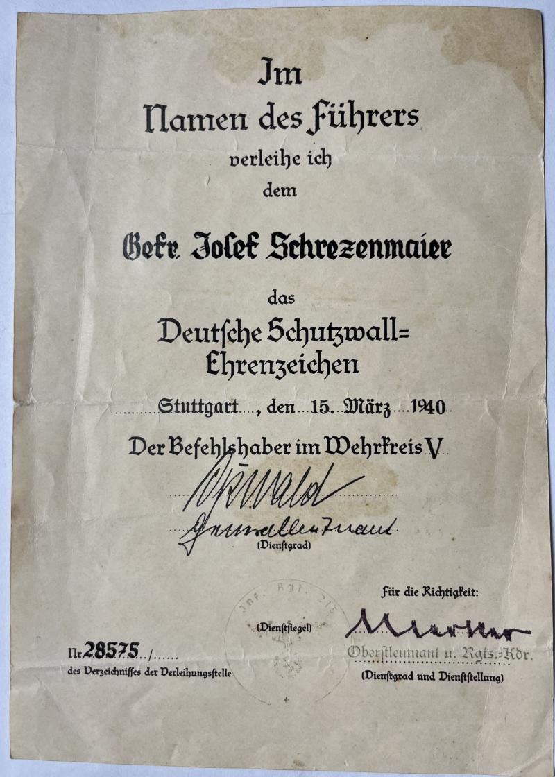 Springerum was awarded the "Deutsces Schutzwall-Ehrenzeichen" ,the "Schiessabzeichen der 1.Stufe"and the EK II (not entered yet in Soldbuch as he was KIA soon after)